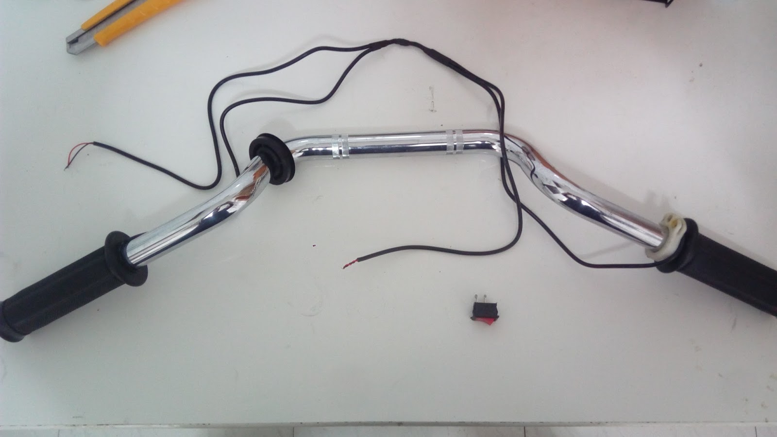 Lo siguiente que hice fue poner cinta aislante en el manillar izquierdo. La idea es aislar (aunque sea mínimamente) el calentador del metal, para que no se pierda todo el calor por el manillar. También vale con funda termorretráctil si tienes.
